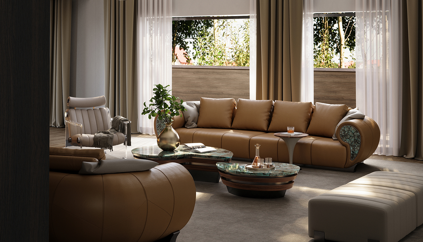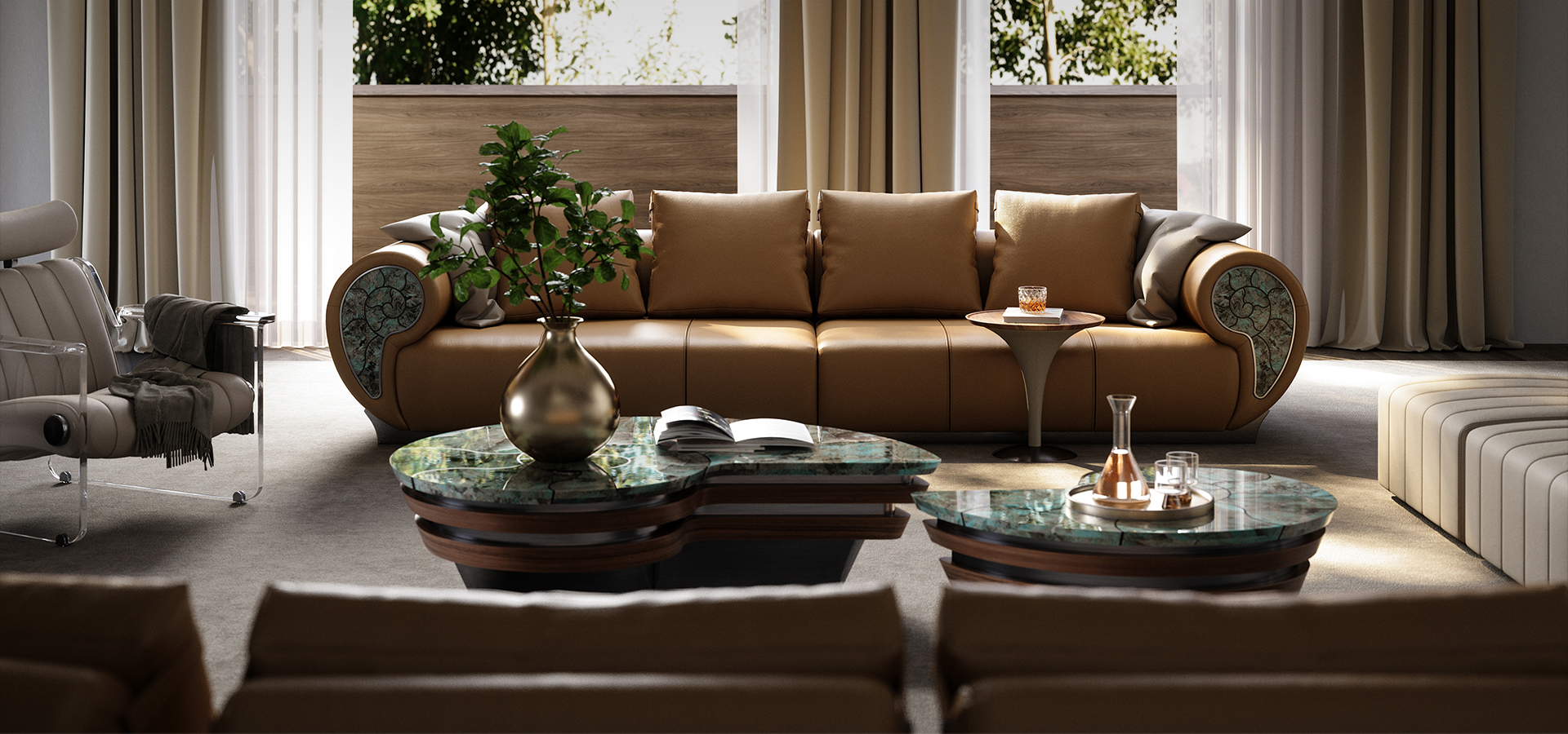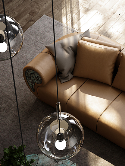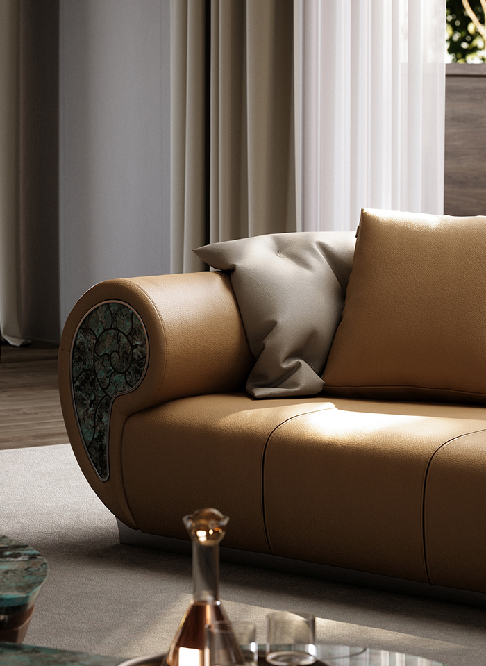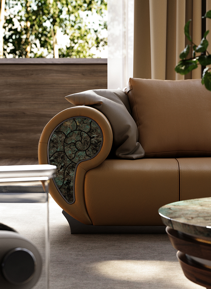 扶手内嵌海螺奢石,造型灵动,寓意美好,把自然美感融入其中,展现了东方美学文化。